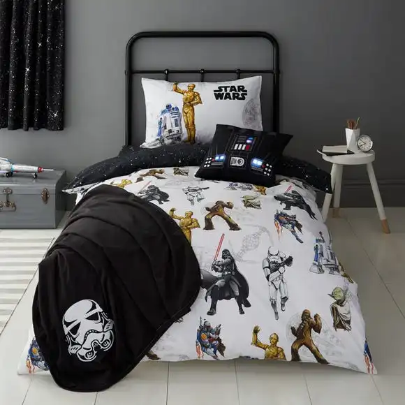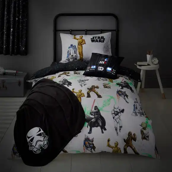 Crafted from a soft yet durable polycotton blend, this duvet cover and pillowcase set features a Disney Star Wars design that glows in the dark with your favourite characters printed onto it. Available in a choice of sizes, it is machine washable and tumble dryer friendly.
