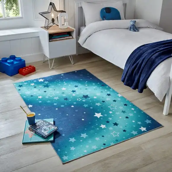 machine washable, folding rugs. The space design is perfect for star gazers and is ideal for kids bedrooms and playrooms. In 100% polyester pile, the low-profile composition shows off its dreamy print. And if it gets dirty, just wash it and lay it back down!Care: Shake or vacuum to remove any loose fibres, dirt and debris using a nozzle attachment. In the case of an accidental spillage, blot with a clean and dampened cloth. Add an anti-slip underneath your rug to prevent your rug from slipping.
