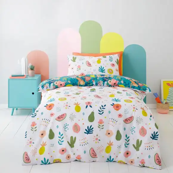 This duvet cover and pillowcase set features a bright and fun jungle carnival design. Printed onto the 100% cotton canvas is an array of jungle animals in jungle foliage, the reverse sees a design made of florals, foliage and fruits. Complete with a button fastening, this duvet cover and pillowcase set boasts easy care qualities and can be fully machine washed.