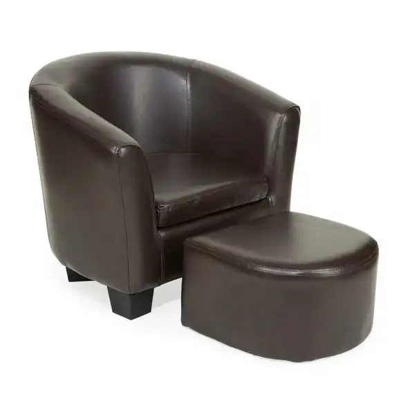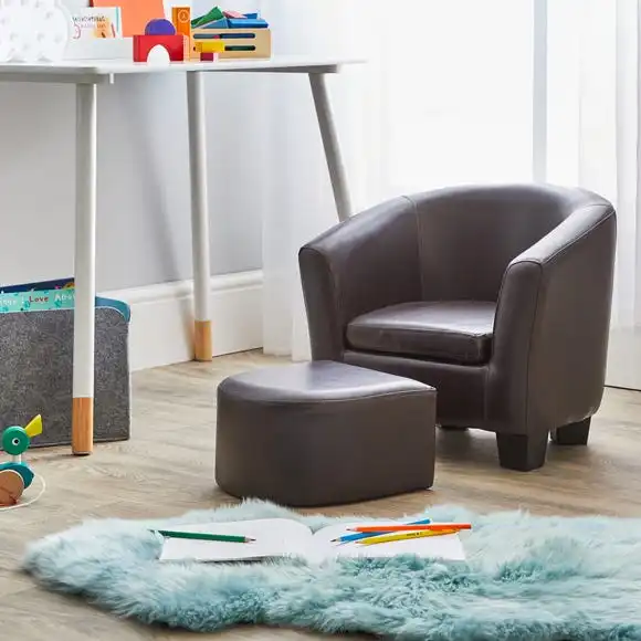 A stylish addition to any kids room, this fully assembled brown tub chair comes with a matching footstool and is ergonomically designed for kids’ healthy seating. Easy to clean and crafted with UKFR materials.