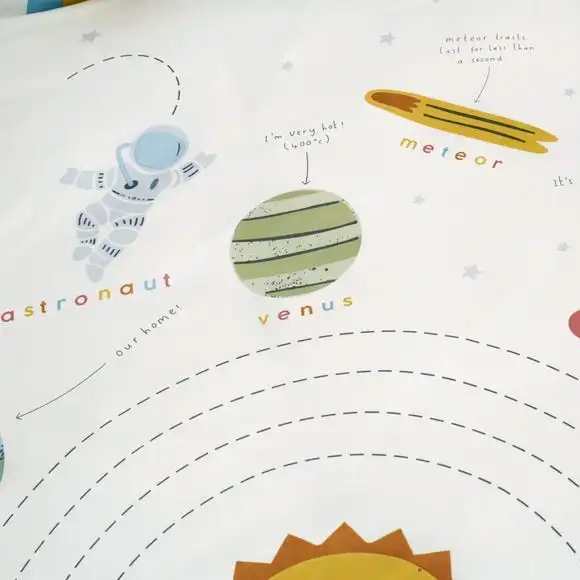 Your room will look out of this world with this Outer Space Scandi duvet cover and pillowcase set. It’s made from a soft blend of recycled polycotton in a 144 thread count which is machine washable for convenient cleaning. Cleverly crafted with a reversible design so you little space lover can enjoy two bedding prints in one. It comes complete with a matching pillowcase and is finished with a secure button closure for an uninterrupted night sleep.
