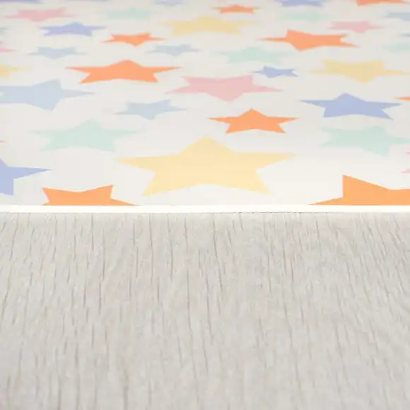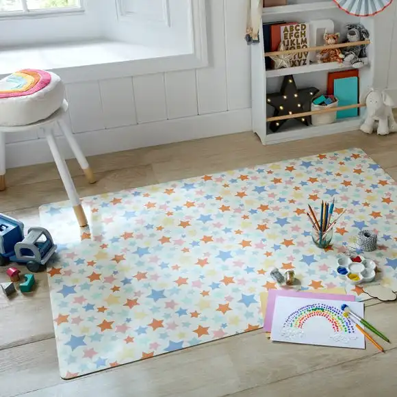 Little ones will love our Allegra Stars Vinyl Kids Mat. With a vibrant multi coloured pattern, this 100% vinyl mat is perfect for kids. The low-profile design is hard-wearing, wipe-clean and moppable meaning it’s the ideal choice for under high chairs and messy play areas and perfect for protecting floors from inevitable mess and spills. The Allegra Stars Vinyl Mat is child and pet friendly. We love using in kitchens and dining rooms to add a cushioned element to hard floors and some colourful style to your family spaces.
