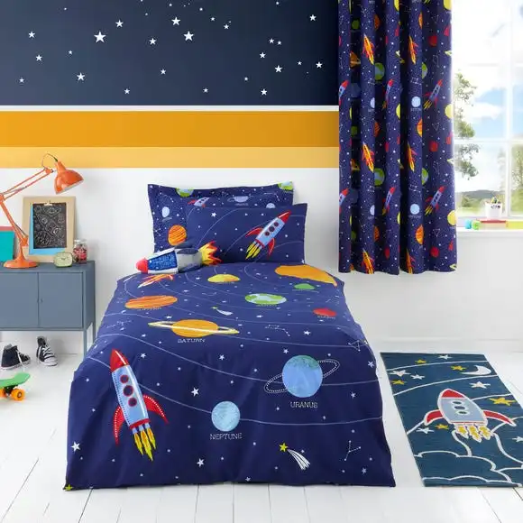 Colourfully decorated with a space themed print featuring rockets, planets and stars, this duvet cover and pillowcase set has been designed with a fun and unique feature; when it goes dark, the stars glow. Perfect for the space enthusiast, this duvet cover set comes with a matching pillowcase included. Coordinating items are also available.