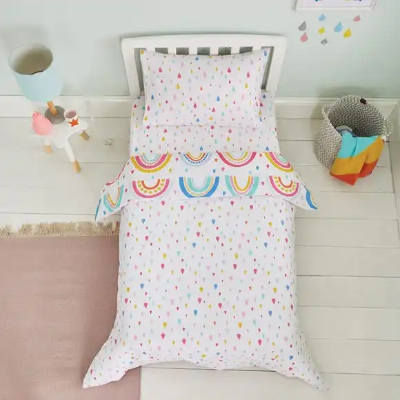 Boasting a colourful rainbow design, this Elements Rainbow Cot Bed Duvet Cover and Pillowcase Set is perfect for brightening up your little one’s bedroom. Beautifully made from 100% cotton, this bedding set is soft, durable and machine wahsbale. This bedding set has a reversible design, so you can choose between two funky pints.