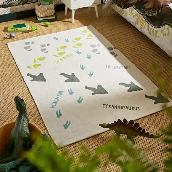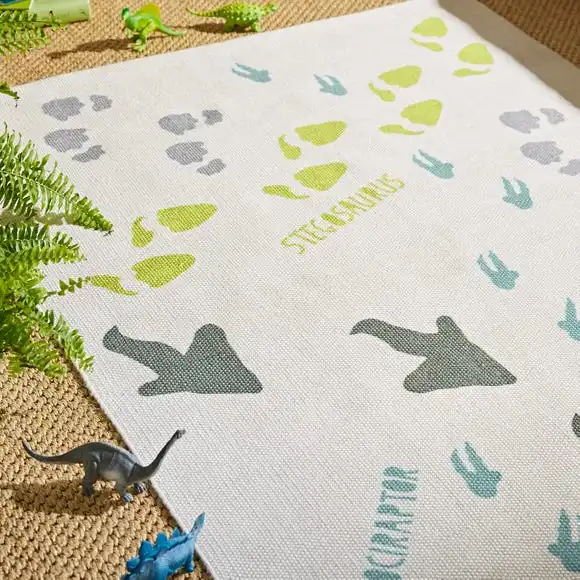 Go back in time with the All About Dinosaurs Rug. The fun footprint style adds an interactive element, perfect for sparking the imaginations of children. In a lively blue and green palette the All About Dinosaurs Rug is an ideal design for adding a playful look to your little explorers room. Crafted in 100% polyester, the flat surface is versatile and durable, perfect for on-the-go zones. We love using this design to add an extra element of play in little ones rooms.